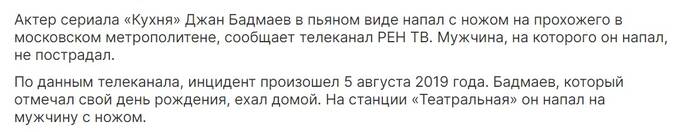 Тогда эта новость мало кого заинтересовала, мелькнув и пропав в ленте новостей, но вот попытки ее вычистить вызвали обратный эффект – теперь всем стало интересно, что же такого случилось три года назад, что Бадмаев судорожно это чистит? А случилась банальная и привычная для России история. Актер, которому кроме славы сильно ударил в голову алкоголь, выпитый им в честь собственного дня рождения, напал на прохожего.