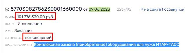 Всего таких контрактов только в июне было на сумму более, чем 275 млн руб. Самый крупный на 101.7 млн руб., заключенный 9 июня. Предмет закупки - комплексная замена (приобретение) оборудования для нужд ИТАР-ТАСС. Какого оборудования, как и кто исполнитель заказа – непонятно.