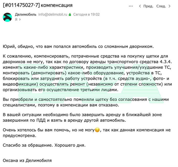 Однако там заботу Юрия не оценили. Мужчине ответили, что он поменял дворник без согласования и деньги ему не вернут. Мол, нужно было закончить аренду (хотя в дороге это было сделать невозможно, так же как и ехать с поломкой до зоны завершения аренды), припарковать авто и взять новое.