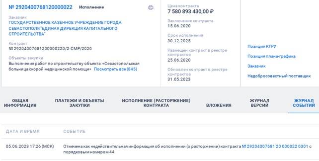 Казалось бы, гнать такого подрядчика надо поганой метлой. Ан нет. Контракт редактируют, условия для исполнителя рихтуют, но договор не расторгают и подрядчика в чёрный список никто не вносит. Более того, в начале июня 2023 года в карточке тендера появилась запись - "отмечена как недействительная информация об исполнении (о расторжении) контракта № 29204007681 20 000022 0301 с порядковым номером 44". Неужели была попытка исправить ситуацию, но потом нашлась "сильная рука", которая погрозила пальцем?