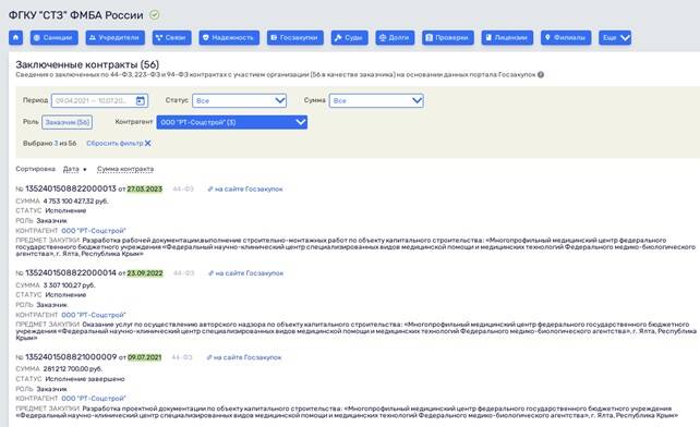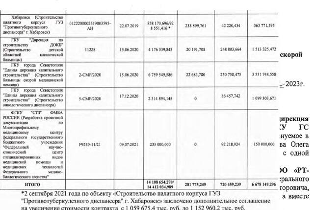 Есть претензии к "РТ-Соцстрою" и от других заказчиков. Например, от федерального госучреждения "Служба технического заказчика" Федерального медико-биологического агентства, с которым у ООО было три контракта на сумму свыше 5 млрд рублей. Все связаны с объектом - Федеральный научно-клинический центр специализированных видов медицинской помощи и медицинских технологий Федерального медико-биологического агентства в Ялте. Последний контракт на 4,7 млрд рублей заключён в августе 2022 года.