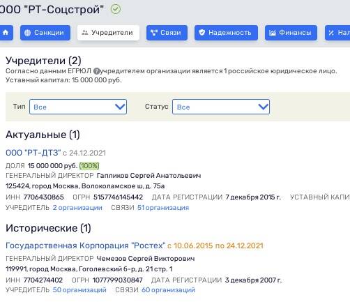 Более того, по непонятной причине эту "дочку" "Ростех", ранее владевший активом напрямую, передал под крыло ООО "РТ-ДТЗ", которое уже является собственностью госкорпорации. Эта же "РТ-ДТЗ" (РТ-Дирекция технического заказчика) стала и руководить ООО "РТ-Соцстрой" с 2021 года. То есть появилась ещё одна прослойка от "дочки" до материнской госкорпорации.
