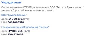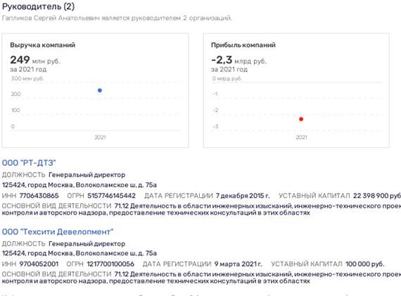 В том же 2021 году "РТ-ДТЗ" возглавил Сергей Гапликов, который примерно тогда же стал руководителем свежеиспечённого в тот же день нового актива госкорпорации (доля - 49%) - ООО "Техсити Девелопмент". Владельцем контролирующей доли в этой компании является ООО "Группа Крокус" олигарха, №100 в списке Forbes "200 богатейших бизнесменов России — 2021" Араса Агаларова (в конце апреля 2023 года из владельцев вышел Амин Агаларов).
