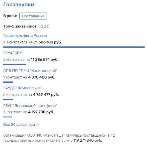 Интересно и то, что целый ряд госконтрактов все еще находятся на исполнении, с 2011 и 2015 года. Как это возможно? Другой блок контрактов не был исполнен до конца. Например, контракт с Госфильмофондом России на обслуживание кинопрокатного оборудования стоимостью в 14 млн рублей. Интересно, что ООО "МС-Макс Раша" оказалась единственным участником торгов. Контракт расторгли по соглашению сторон.