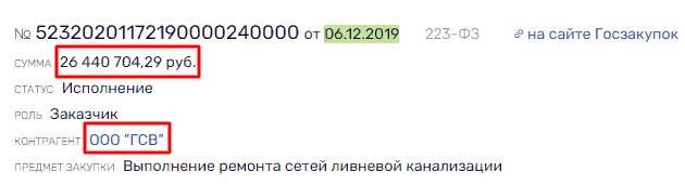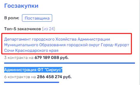 МУП г. Сочи «Водосток» - один из подрядчиков Департамента и ему же принадлежащая структура, выступало заказчиком на сумму 552 млн руб. Самый крупный контракт на 26 млн руб. был заключен в конце 2019 г. с ООО «ГСВ» на ремонт сетей ливневой канализации. Исполнение не завершено, компания находится в процессе ликвидации.