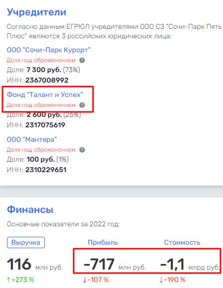 У фонда «Таланты и успех» есть «дочки», среди которых ООО СЗ «Сочи-Парк пять плюс». Через него могут выводиться деньги государственного банка «ДОМ РФ». Доли учредителей компании находятся под его обременением. ООО СЗ «Сочи-Парк пять плюс» никогда не имело выручки, убыток в 2022 г составил 717 млн руб., отрицательный капитал – 1.1 млрд руб.