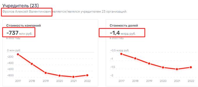 Зарабатывает у Алексея Фролова ООО «Флэш Энерджи», чья выручка в 2022 г. составила 3.7 млрд руб., прибыль – 164 млн руб. Деньги могут выводиться через «дочку» ООО «Масленица», которое не имеет прибыли с 2017 г.