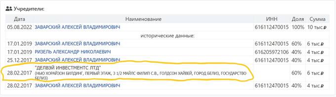 На этом фоне весьма примечательно выглядит тот факт, что учредителем еще одной фирмы Заварского, ООО «Кворум», до 2017 года являлся офшор из Белиза: