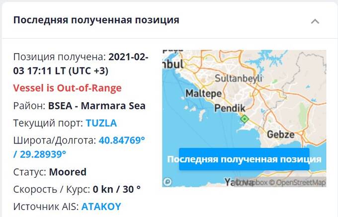 Так и случилось – с марта 2021 года «Лев Солдатов» брошен у берегов Турции в точке с координатами 40.84769° / 29.28939° в Мраморном море: