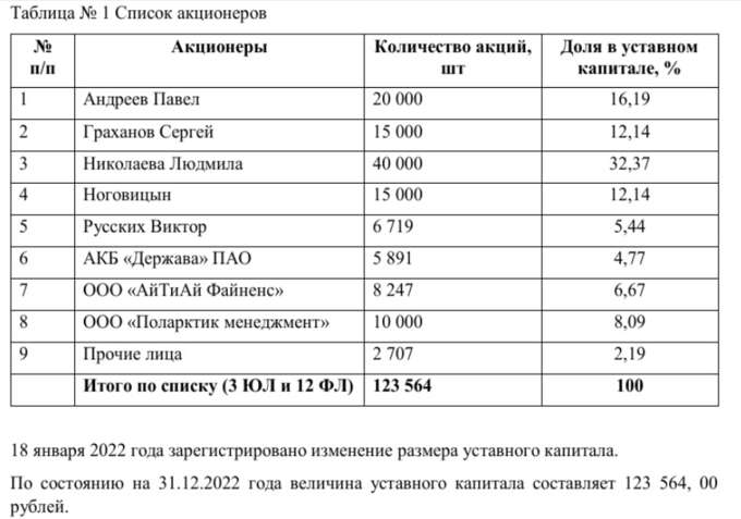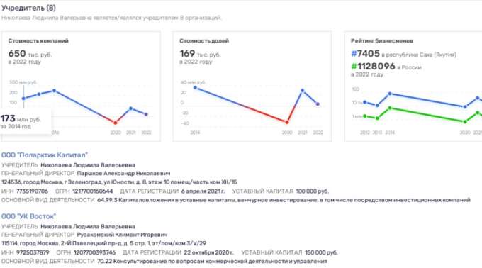 Что касается иных активов Людмилы Николаевой, то она владеет также долями в двух московских компаниях - ООО "Поларктик Капитал" и ООО "УК Восток". Обе в 2022 году демонстрировали убытки.