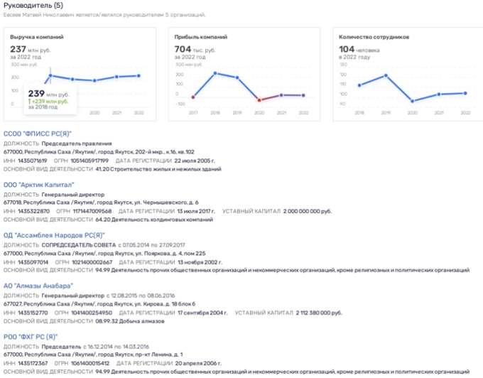 Кроме того, у Андрея Карху, судя по всему, также остались тесные связи с "Алросой" и местными политиками. У него ранее была доля в другой золотодобывающей компании - ООО "Анжу", которую он передал Михаилу Андреевичу Карху. Так вот, совладелец "Анжу" - ООО "Арктик Капитал" Матвея Евсеева, который в свою очередь - член регионального политсовета партии "Единая Россия" в Якутии, экс-директор АО "Алмазы Анабара", депутат местного парламента (Ил Тумэн) ряда созывов.