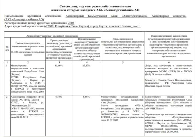 Для компании, где 32,37% акций (по данным на 7 июля 2023 года) принадлежат полной тёзке жены главы Якутии Айсена Николаева - Людмиле Николаевой, была открыта рамочная кредитная линия с лимитом долга 360 млн рублей на срок - по 19 июня 2024 года на пополнение оборотных средств, в т.ч. внесение вклада в имущество ООО "Арктическая горная компания". И открыта она была в "Алмазэргиэнбанк", где 87,37% голосующих акций принадлежат Якутии (на конец февраля 2020 года), а обязанности акционера выполняет министерство имущественных и земельных отношений республики. Любопытное совпадение: глава этого министерства, что выполняет обязанности акционера, назначается указом Айсена Николаева, как и было в случае с Павлом Ивановым.