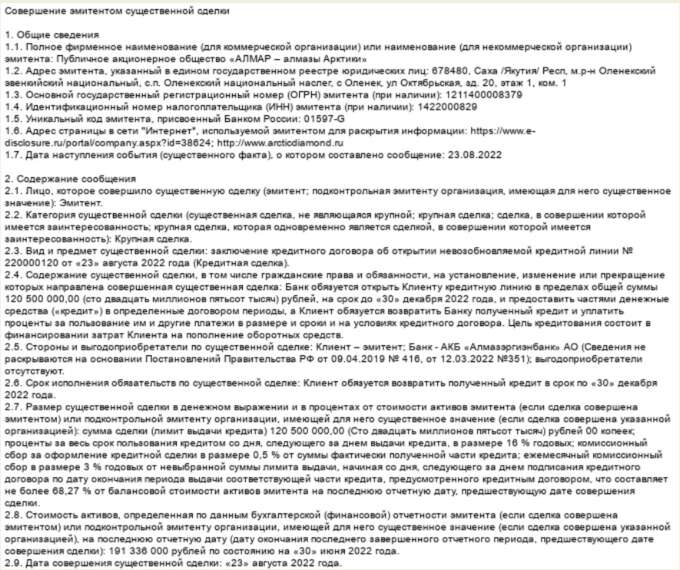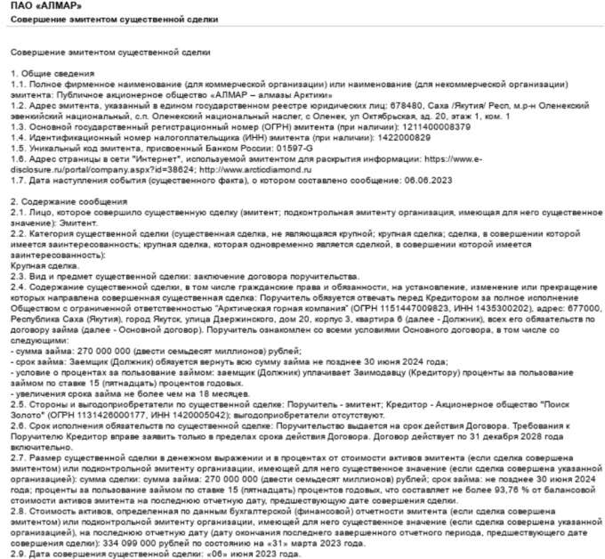 20 июля 2023 года на сайте раскрытия информации появились сведения о том, что ПАО "Алмар – алмазы Арктики" совершило крупную сделку.