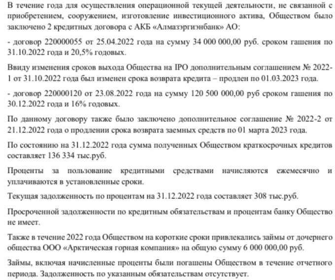 По данным ФНС РФ, ПАО "Алмар" как в 2022 году, так и в 2021 году демонстрировало чистые убытки - 56,07 млн рублей и 16,9 млн рублей, соответственно. Убыток "Арктической горной компании" за 2022 год был 9 млн рублей против 12 млн рублей убытка годом ранее. А почему, собственно, это не смущает банк-кредитор? При том, что само "Алмар" было учреждено в июле 2021 года, то есть свежеиспечённая фирма с убытками и вдруг многомиллионные кредиты от банка с госучастием. А что, так можно было? Или такие условия не для всех, а только лишь избранным?