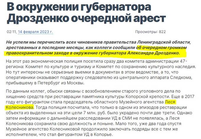 Леся Колесникова – представительница направления культуры. Так, в феврале обыски провели сразу в двух комитетах 47-региона. Речь идет о комитете культуры и туризма, а также о комитете по сохранению культурного наследия. Причиной для обысков стала старая уголовка, которая касается масштабного хищения денег в ходе реставрации Копорской крепости.