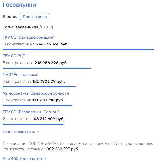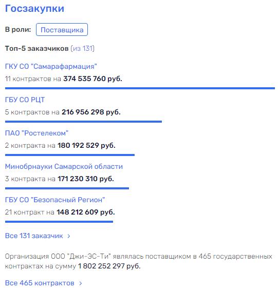 Самарским "Джи-ЭС-Ти" владеют Алексей Малыхин и Ольга Киреева. Структура имеет госконтрактов на 1,8 млрд рублей. Из них на первом месте - как раз ГКУ СО "Самарафармация" с объемом в 374 млн рублей по 11 госконтрактам.