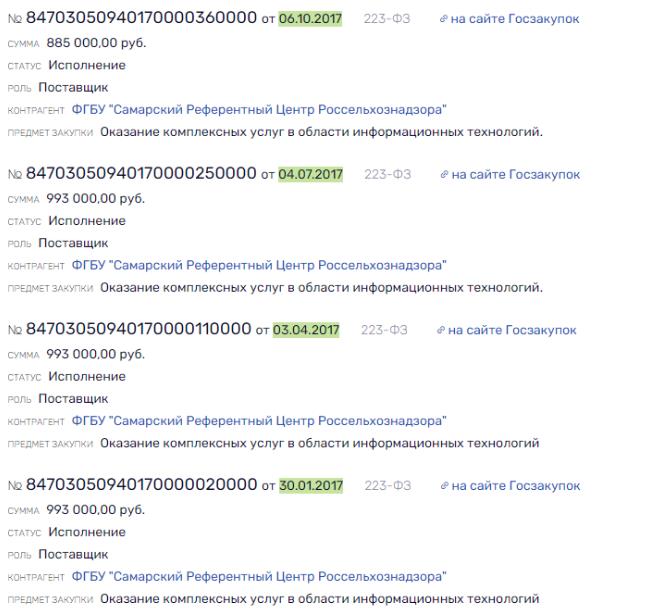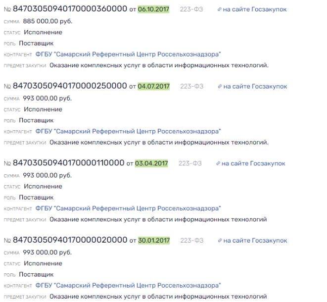 Интересно и то, что у "Джи-ЭС-Ти" оказалась целая серия госконтрактов с ФГБУ "Самарский Референтный Центр Россельхознадзора" на миллионы рублей. Напомним, ранее Игнатова трудилась в структурах Россельхознадзора. И как раз в те годы, 2016-2017, когда заключались и исполнялись эти контракты. Совпадение? Основная масса - предоставление комплесных услуг в области информационных технологий. И, если верить сервису "Руспрофайл", эти контракты все еще находятся на исполнении - спустя шесть лет!