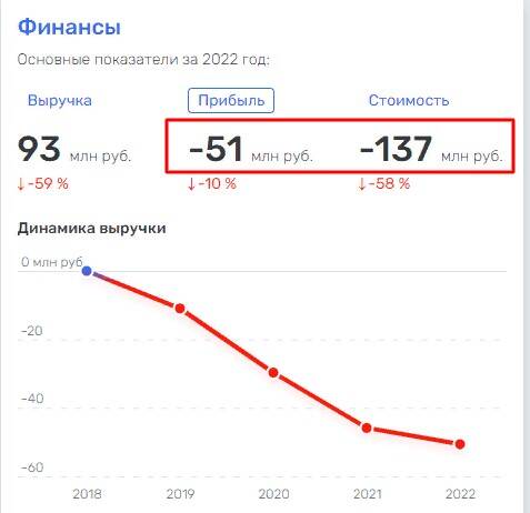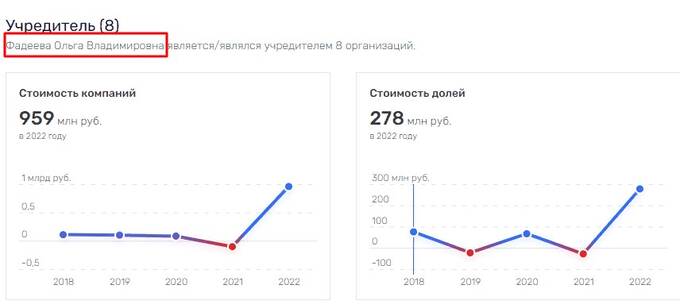 Деньги из них могут выводиться через ООО «ЗИМ», принадлежащее Фадеевой. При выручке компании в 2022 г. 93 млн руб. она ушла в минус на 51 млн руб., прибыли не имеет с 2018 г.