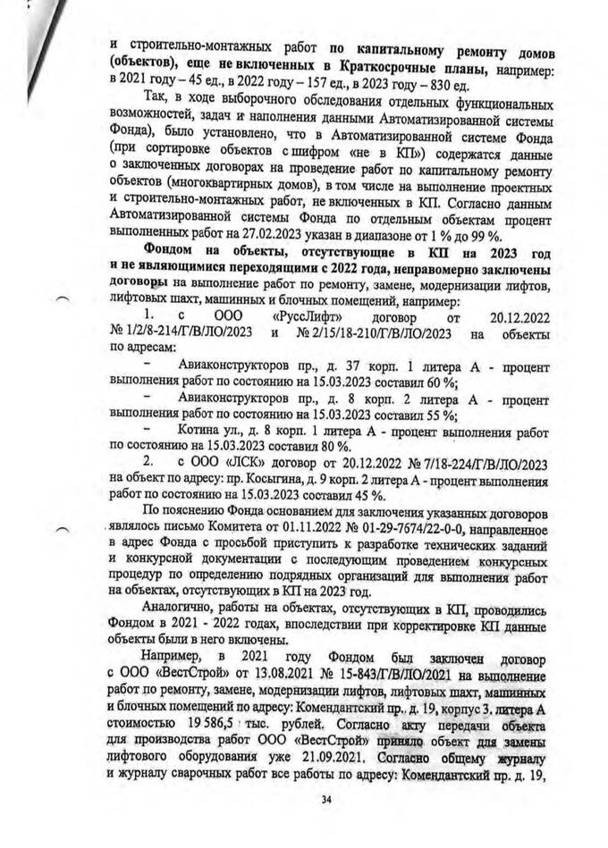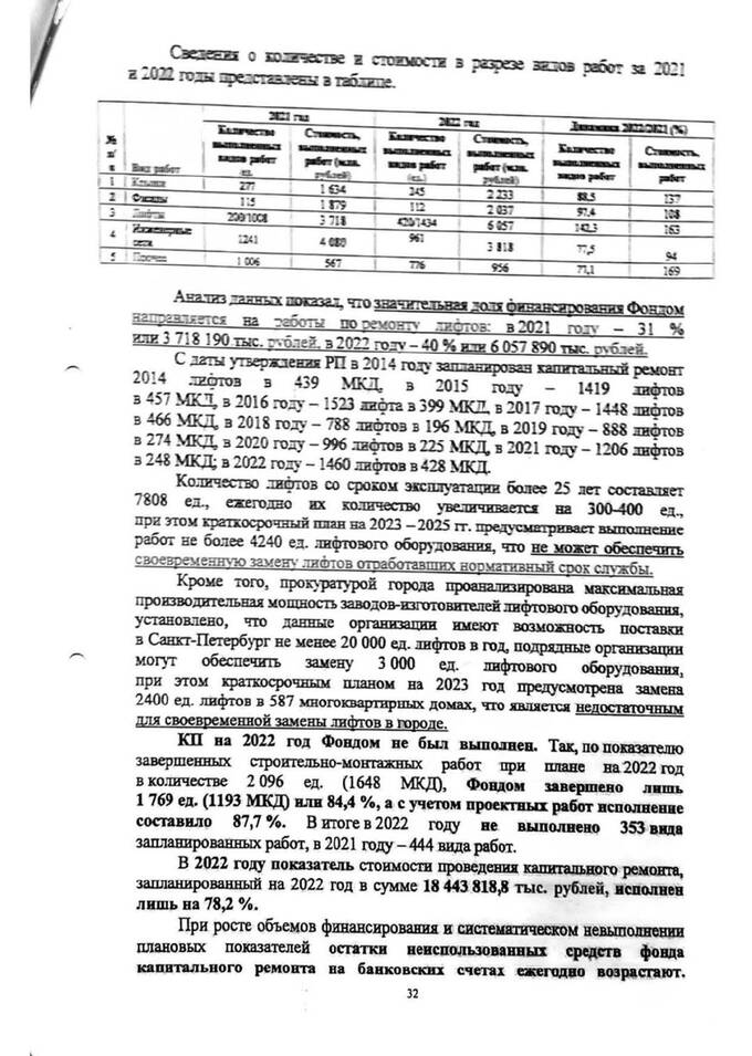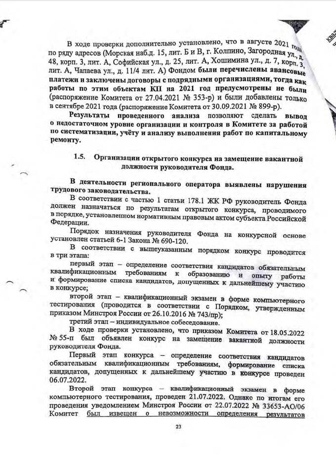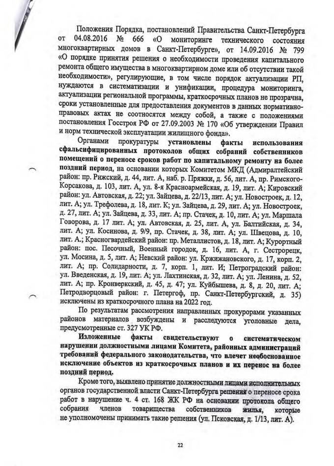 1. Выявлены факты фальсификации протоколов общих собраний собственников, на основании которых Жилищным комитетом СПб из краткосрочного плана 2022 года было исключено множество объектов. (стр. 22)