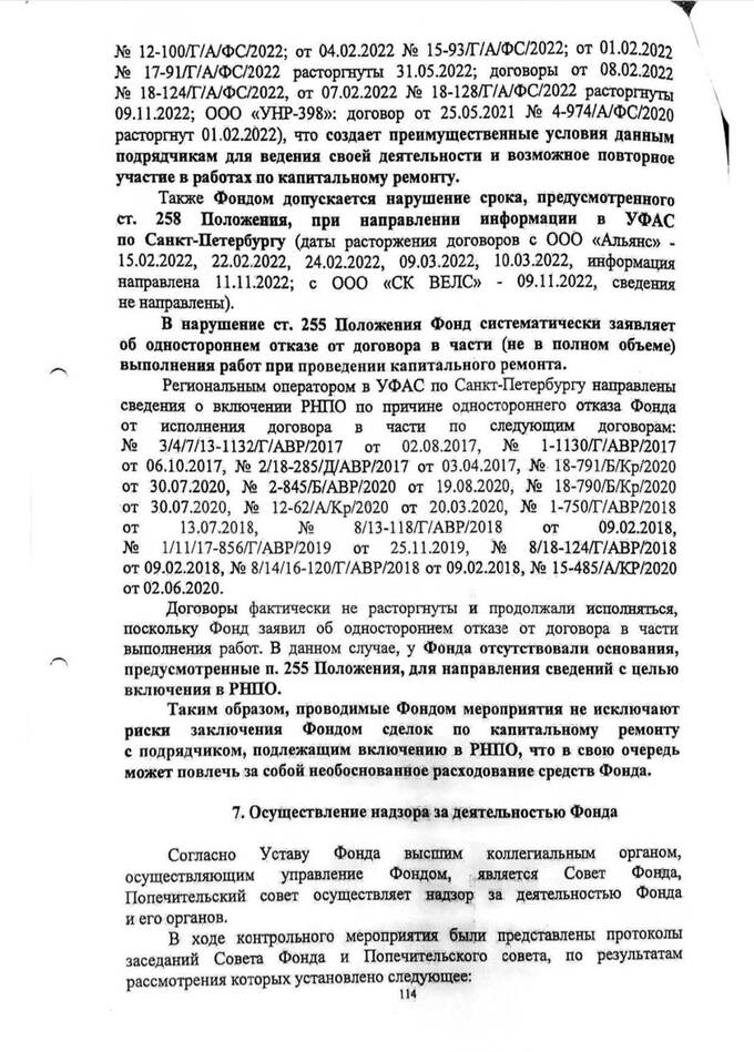 8. Выявлено, что проверки регионального оператора, проводимые Жилищным комитетом СПб, проводятся формально и не выявляют сколь значимых нарушений, а Советом Фонда и Попечительским Советом Фонда не реализуются полномочия ни по одному из вопросов, утвержденных Уставом Фонда. (стр. 115)