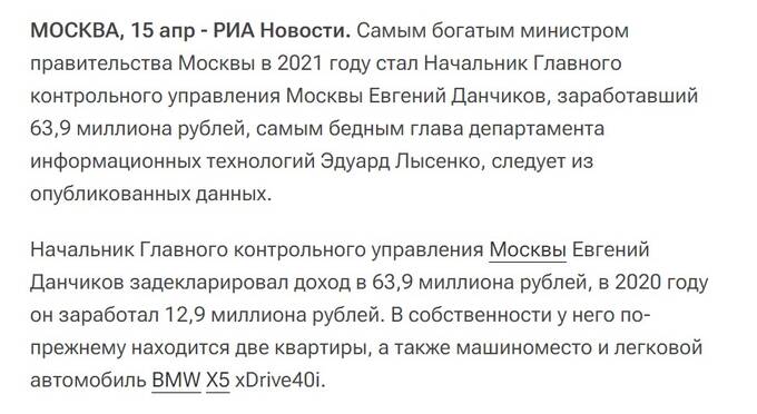 Что касается декларации, то в 2021 году Евгений Данчиков стал самым богатым министром Москвы, о чем официально сообщили РИА Новости: