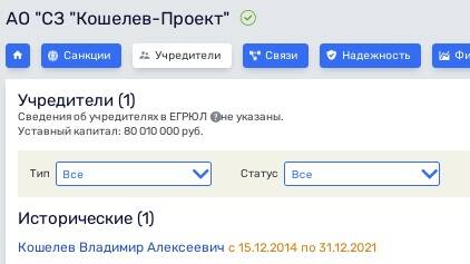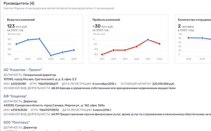 По имеющимся данным, пойдя во власть, г-н Кошелев передал свои активы матери Татьяне Дедовой и супруге - Марине Карпяк. Если смотреть в ЕГРЮЛ, то действительно часть активов, ранее принадлежавших Кошелеву, перешли к Дедовой Татьяне Вениаминовне и Карпяк Марине Александровне.