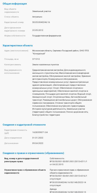 По данным из разрешения на строительство, размещать объект планируется на участке с кадастровым номером 50:05:0040246:16. В базе Росреестра площадь участка с таким кадастровым номером составляет чуть более 37 га, а кадастровая стоимость - порядка 1,6 млрд рублей.