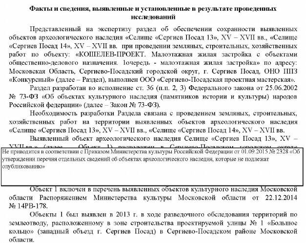 Зачем же потребовалась повторная экспертиза уже в 2023 году? Возможно, причина в том, что застройка может затронуть выявленный объект культурного (археологического) наследия "Селище "Сергиев Посад 13", XV – XVII вв., "Селище "Сергиев Посад 14", XV – XVII вв.