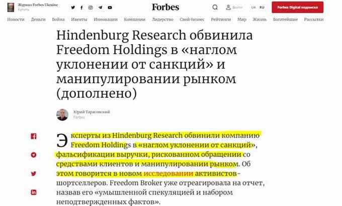 Есть еще один момент, на который мы хотим обратить ваше внимание сегодня. В середине августа на страницах популярного и рейтингового издания «Forbes» был опубликован резонансный и скандальный материал под названием «Hindenburg Research обвинила Freedom Holdings в «наглом уклонении от санкций» и манипулировании рынком».