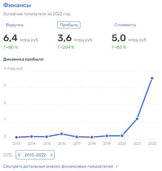 Куда больше средств предприятие получает за счет работы с негосударственными контрагентами. По итогам 2022 года прибыль компании составила 3,6 млрд рублей при выручке в 6,4 млрд рублей, показав взрывной рост за год - более 200%.