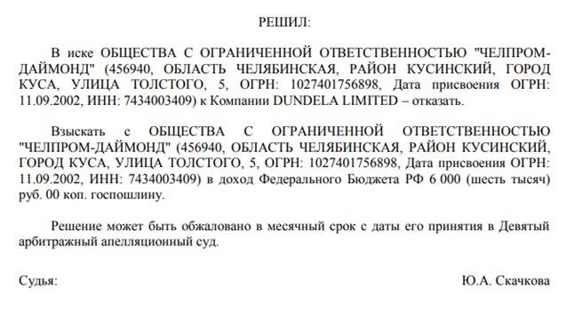 В 2012 году между фирмами "ЧелПром-Даймонд" и Dundela Limited был подписан договор о купле-продаже алмазов на сумму 10 млн долларов. Позже сумма сделки сократилась до 1,25 млн долларов. В июле 2013 года ООО "ЧелПром-Даймонд" передала покупателю товар.