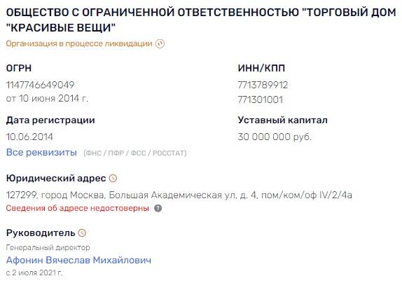 В июле 2023 года ООО "Торговый Дом "Красивые Вещи" вошло в процедуру ликвидации на основании недостоверных сведений, предоставленных собственниками и руководством предприятии в ЕГРЮЛ. Вот и сказочке конец. А "бриллиантовые руки" Никиты Сергеевича оказались длинными и мозолистыми. Человек явно умеет зарабатывать деньги.