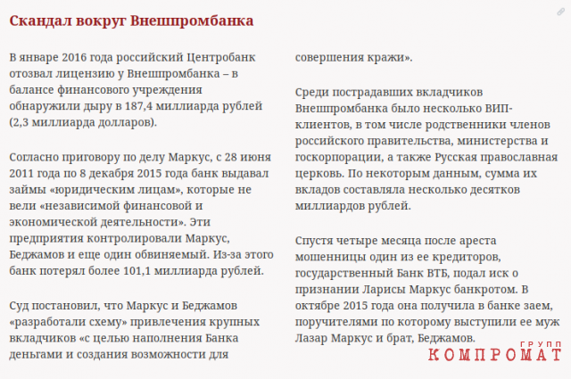 Ларису Маркус, которая вместе с Беджамовым владела российским Внешпромбанком, арестовали в декабре 2015 года. В мае 2017-го она созналась в хищении 1,8 миллиарда долларов из банка и получила девять лет тюрьмы – срок позже сократили на шесть месяцев. Российские власти по-прежнему пытаются изъять активы Маркус и Беджамова, который тоже был причастен к мошеннической схеме.