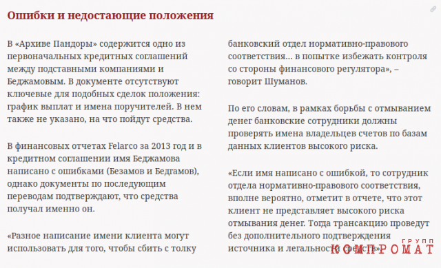 Документы из «Архива Пандоры» также раскрывают, как Беджамов вывел часть украденных из банка средств. Бизнесмен и партнеры использовали для перемещения по миру десятков миллионов долларов сложную схему. По всей видимости, аффилированные компании выдавали друг другу займы с сомнительными деталями: сроки и условия погашения в договорах не указывали, а названия предприятий писали с ошибками.