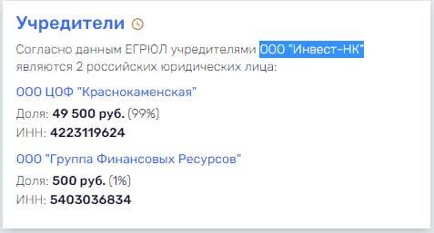 На сегодняшний день ООО «Инвест-НК» принадлежит ООО ЦОФ «Краснокаменская» и ООО «Группа Финансовых Ресурсов». Учредители ООО ЦОФ «Краснокаменская» - ООО «Группа Финансовых Ресурсов» и ООО «Инвест-НК». Такая схема перекрестного владения часто используется, чтобы скрыть следы вывода денег.