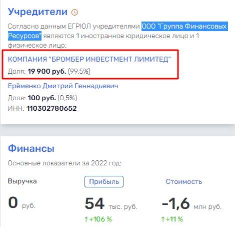 ООО ЦОФ «Краснокаменская» в 2022 г. получило выручку 8.8 млрд руб. и прибыль 841 млн руб. Деньги могут быть выведены в компанию из ОАЭ «БРОМБЕР ИНВЕСТМЕНТ ЛИМИТЕД», которая вместе с Дмитрием Ерёменко является соучредителем ООО «Группа Финансовых Ресурсов».