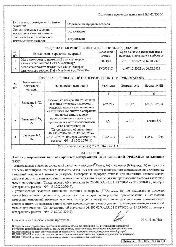 Интересно, что никто из проводивших оценку и измерения протокол испытаний не подписывает. Не хотят исполнители ставить свою подпись и под заключением в протоколе. Протокол подписан «ответственным за оформление протокола» и утвержден ВРИО руководителя Испытательного центра. Возникает вопрос: кто это написал? Кто вместо норм для армянского коньяка из армянского винограда подсунул ответственному за оформление нормы для российской продукции из российского винограда 2017-2019 годов урожая?