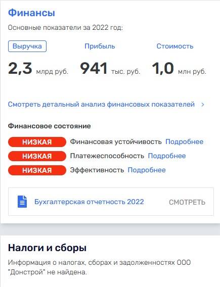 Головная компания АО СК «Донстрой», имеющая 33 дочерних структуры, показывает смешные цифры – выручка в 2022 г. 527 млн руб., прибыль 910 тыс. руб. В 2020 г. выручка была 15 млрд руб., прибыль 117 тыс. руб. Она могла занижаться с целью уклонения от налогов, а это является уголовным преступлением. Сравнение финансовых показателей компании за 2020 г. и 2022 г. свидетельствует о том, что «Донстрой» стремительно катится вниз.