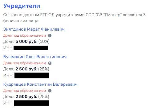 Отдельный интерес представляет компания ООО "СЗ "Пионер", где совладельцами Олега Бушмакина (25%) выступают Константин Кудрявцев (25%) и их старший партнер Марат Зиятдинов. Компания убыточная, и все 100% долей находятся в залоге у "Сбербанка".