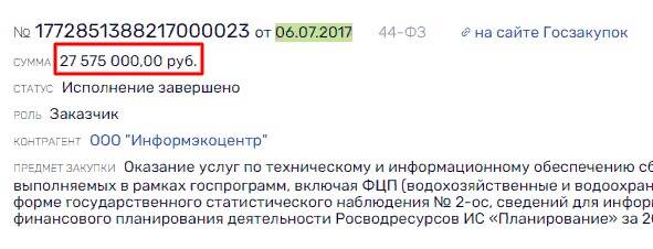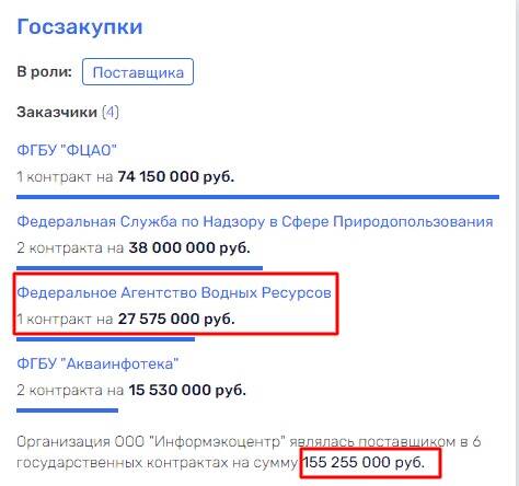 В ТОП-3, кроме уже перечисленных компаний, входило и Федеральное агентство водных ресурсов, являющееся учредителем ФГБУ «Акваинфотека». С агентством был заключен 1 контракт в 2017 г. - Оказание услуг по техническому и информационному обеспечению сбора, обобщения и анализа плановых и отчетных финансово-экономических показателей мероприятий, выполняемых в рамках госпрограмм, включая ФЦП (водохозяйственные и водоохранные мероприятия, а также ФАИП), планов финансово-хозяйственной деятельности ФГУ, данных по форме государственного статистического наблюдения № 2-ос, сведений для информационных систем иных ФОИВ, с использованием информационной системы производственного и финансового планирования деятельности Росводресурсов ИС «Планирование» за 2016 год (итоговые) и в 2017-2018 годах. В 2017 г. гендиректором агентства был Вадим Никаноров.