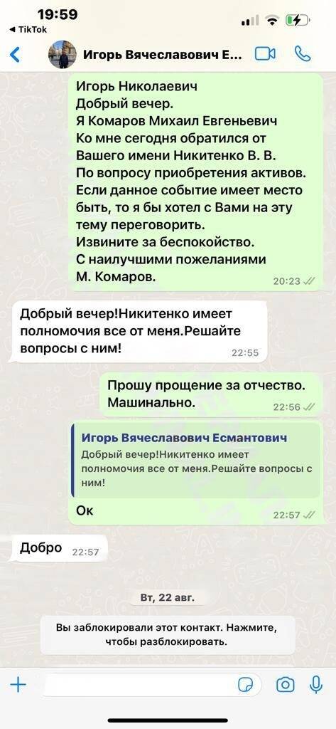 Напоминаем, что г-н Никитенко утверждал, что представляет интересы г-на Есмантовича.