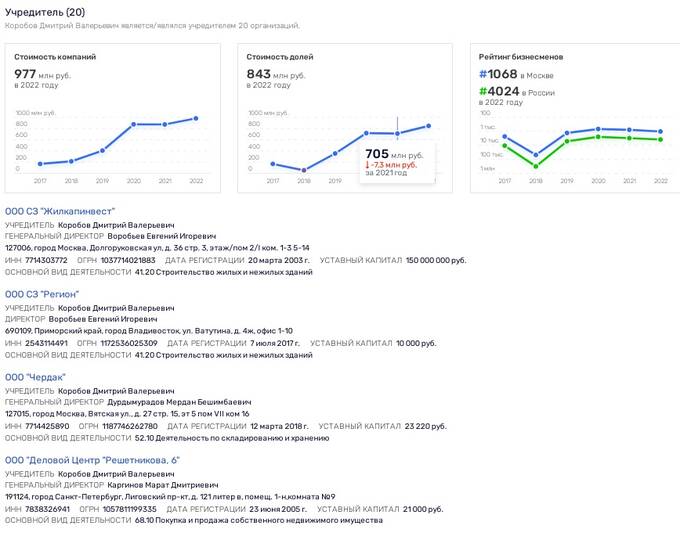 На сегодня за Коробовым числятся доли в 16 действующих компаниях Москвы, Санкт-Петербурга, Владивостока, Владимирской области, большая часть из которых работает именно в строительном секторе. Часть компаний входят в группу "Жилкапинвест". При этом строительство ЖК у Коробова во Владивостоке не обходится без претензий надзорных органов, а тут ещё о проекте в дорогостоящем пригороде столицы Приморья, похоже, придётся забыть.