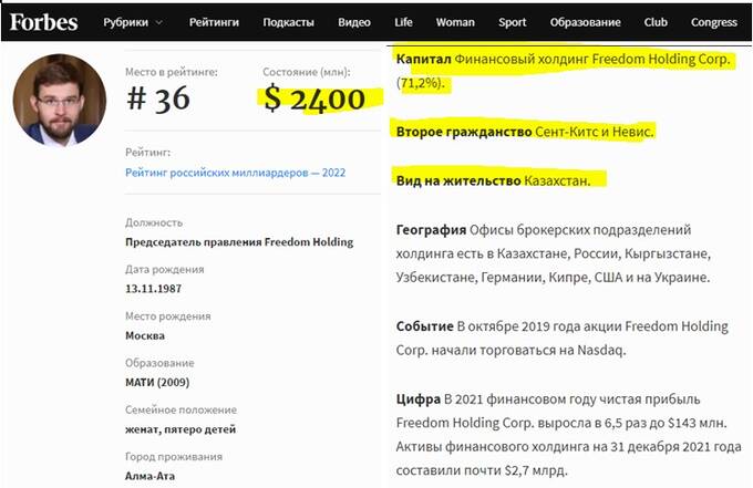 А правда заключается в том, что Турлов – миллиардер-схематозник, у которого есть собственная международная финансовая пирамида «Фридом Финанс». И сейчас мы видим следующую ситуацию. Мошенник перебрался жить из России в Казахстан, чтобы оттуда продолжать отмывать российские деньги. При этом он уже успел обмануть со своей пирамидой украинских вкладчиков. В частности, как писало рейтинговое издание «Forbes», после введения санкций в отношении Турлова, клиенты Freedom Finance с Украины в один момент утратили доступ ко всем своим деньгам на счетах и к ценным бумагам. Было заблокировано 3,5 миллиарда гривен, принадлежащих украинским инвесторам.