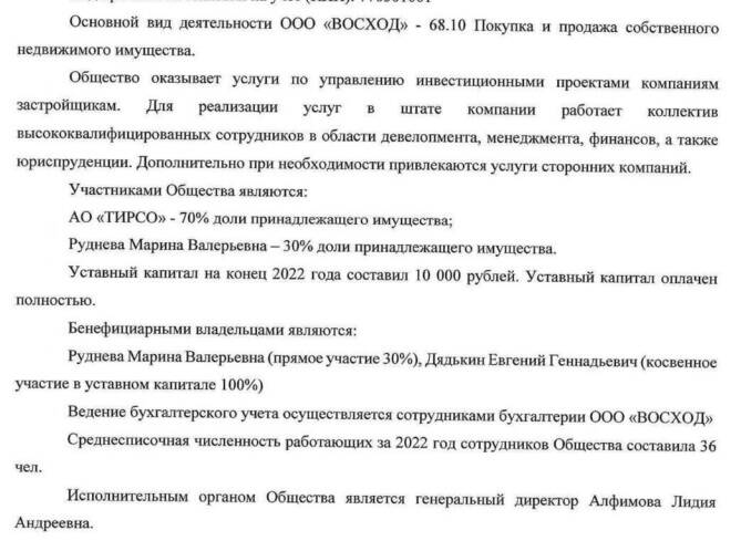 Дядькин же является директором АО "Тирсо", что в "Восходе" владеет 70% доли. Чьи интересы он представляет, установить не удалось, но еще в феврале 2023 года СМИ называли в числе создателей девелоперской группы не только Рудневу, но и акционера O1 Properties – кипрскую компанию RT&I Ващенко и Михайлова. Кроме того, у компании "Восход", судя по отчётности, есть финвложения в компанию Yofoura Holding Limited, которая является акционером инвесткомпании O1 Properties. Так может от перестановки слагаемых сумма и не изменилась?