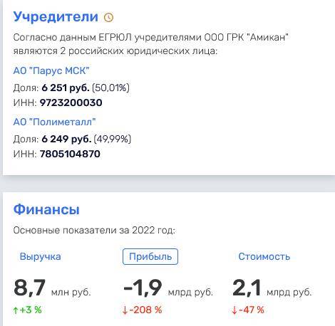 Через ООО ГРК «Амикан» могли выводить деньги, так как его убыток в 2021 г. составил 616 млн руб., а в 2022 г. — 1,9 млрд руб.