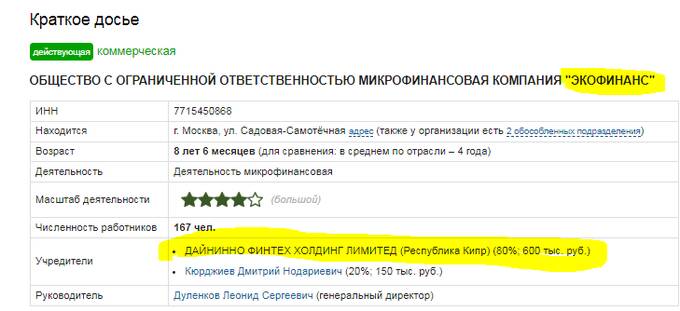 А вот на территории России он владеет микрофинансовой компанией «Экофинанс», которая владеет брендами “CreditPlus“ и ”EcoFinance”. Статусный капитал ООО МФК «Экофинанс» сейчас составляет 750 тысяч рублей, а количество сотрудников — 167 человек.