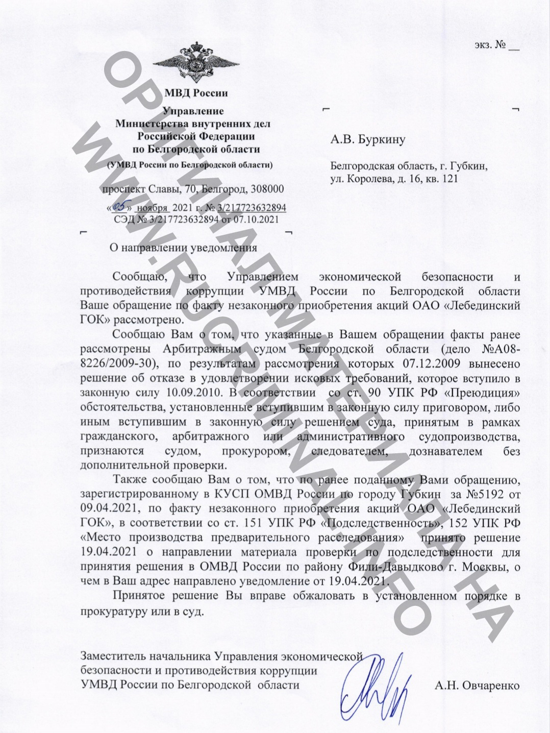 В распоряжении Rucriminal.info оказался ответ Овчаренко от бывшего акционера Андрея Буркина и ассоциация обманутых акционеров ОАО Лебединский ГОК, которые мы и публикуем с небольшими правками.