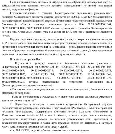 Координатор комитета Георгий Городецкий в своих запросах перечислил кадастровые номера участков, образованных из земель лесного фонда, общая площадь которых превышает 222 га. Он попросил Следком РФ и Генпрокуратуру РФ проверить их законность образования на территории Масловского леса.