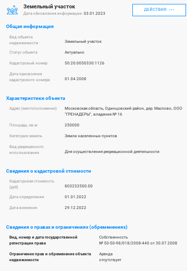 Некое ООО "Рефлект" оказалось собственником участка площадью 150 тыс. кв. м кадастровой стоимостью более 505 млн рублей, ООО "Гренадеры" трёх участков общей площадью 330 тыс. кв. м и общей кадастровой ценой свыше 1 млрд рублей, ООО "Рибмон" - 50 тыс. кв. м стоимостью 186 млн рублей, ООО "Ротума" - 73,9 тыс. кв. м и ценой 266 млн рублей, АОЗТ "Автор" - 11 тыс. кв. м и 84,8 млн рублей, ООО "Простор" - 123,4 тыс. кв. м стоимостью 423 млн рублей, ООО "ФОРЕСТА" - 260 тыс. кв. м стоимостью 831 млн рублей, ООО "ГеоСтрой" - 218 тыс. кв. м и ценой 709 млн рублей, ООО "Имидж Инвест" - 187 тыс. кв. м за 654 млн рублей, ООО "Агроконсалт" - 100 тыс. кв. м стоимостью 349 млн рублей.
