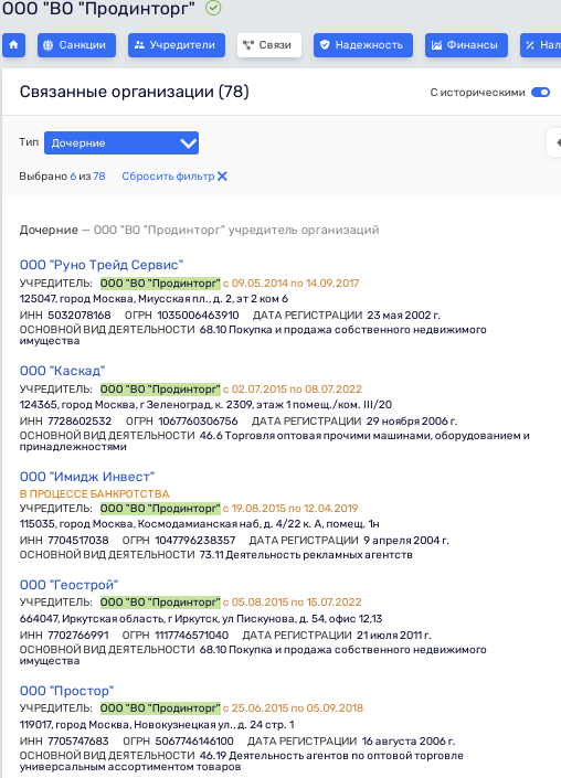 И вот же какое удивительное совпадение: часть этих компаний совпадает с "дочками", в том числе бывшими, вышеупомянутого "Продинторга".